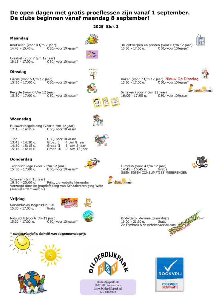 Op studiedagen van De Waterkant gaan onze clubs niet door m.u.v. Judo & Huiswerkbegeleiding. Tijdens vakantiedagen gaat er geen enkele club door.
